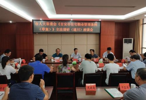 7月15日,由市人大常委会城环工委主任刘水根率领的调研组在我县开展《吉安市住宅物业管理条例(草案)》立法调研。县人大常委会主任陈道萍,副主任李晓东,副县长彭壬盛分别陪同。